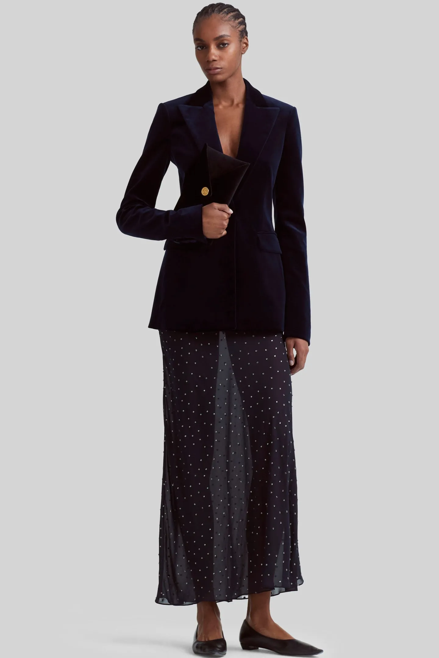 The Beatty jacket is a classic Smoking style inspired by masculine tuxedos from the 1930s. Expertly tailored in Italy from smooth velvet, it’s designed with exaggerated lapels and a cinched waist.